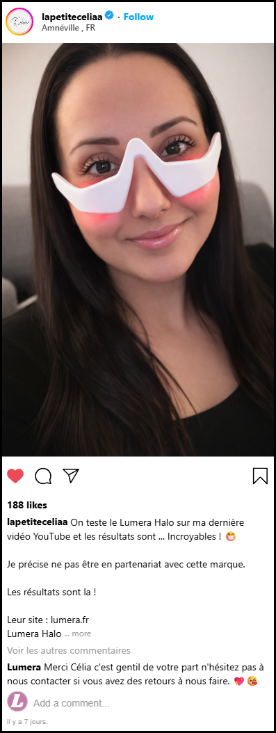 Enfin, le design de Lumera Halo est spécifiquement conçu pour agir sur la zone du contour des yeux, sans cibler directement les yeux lorsqu’il est porté correctement.
